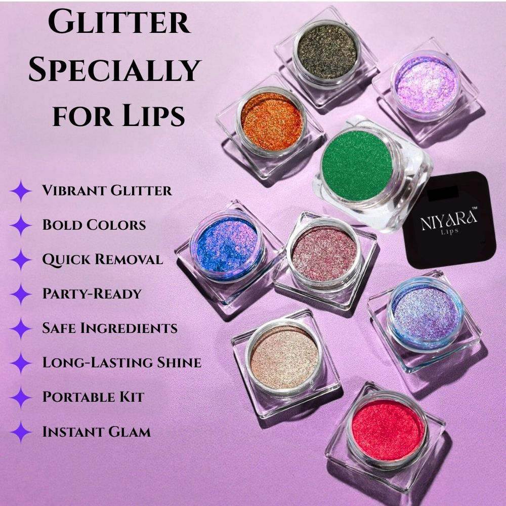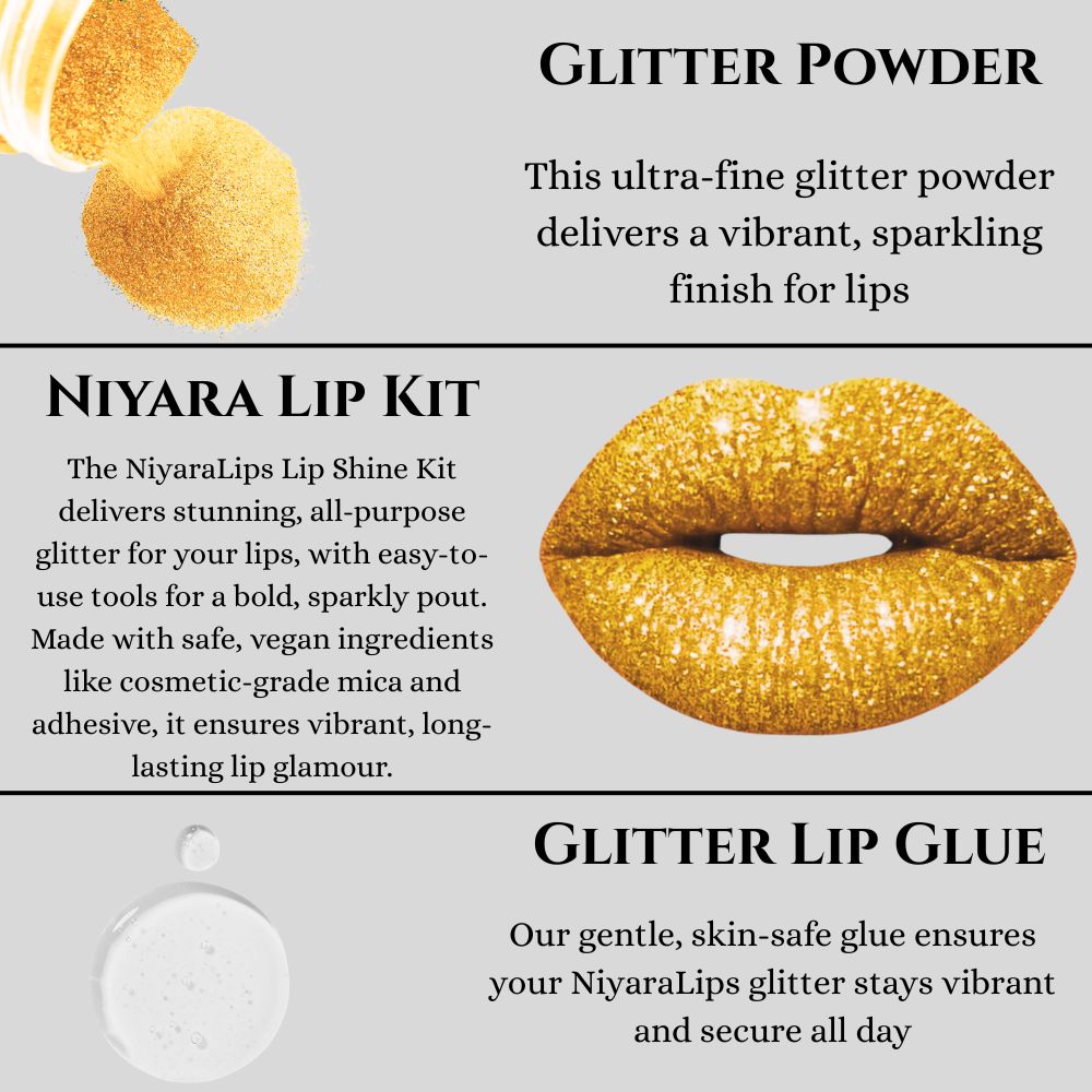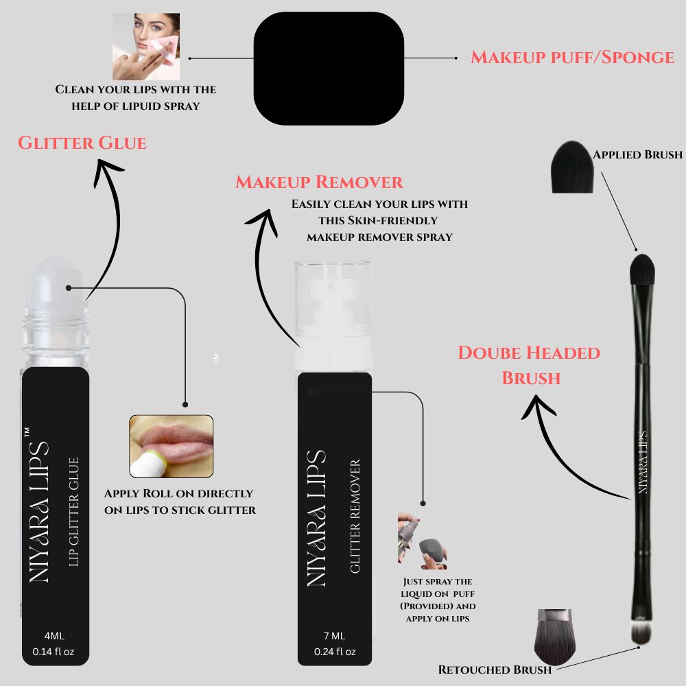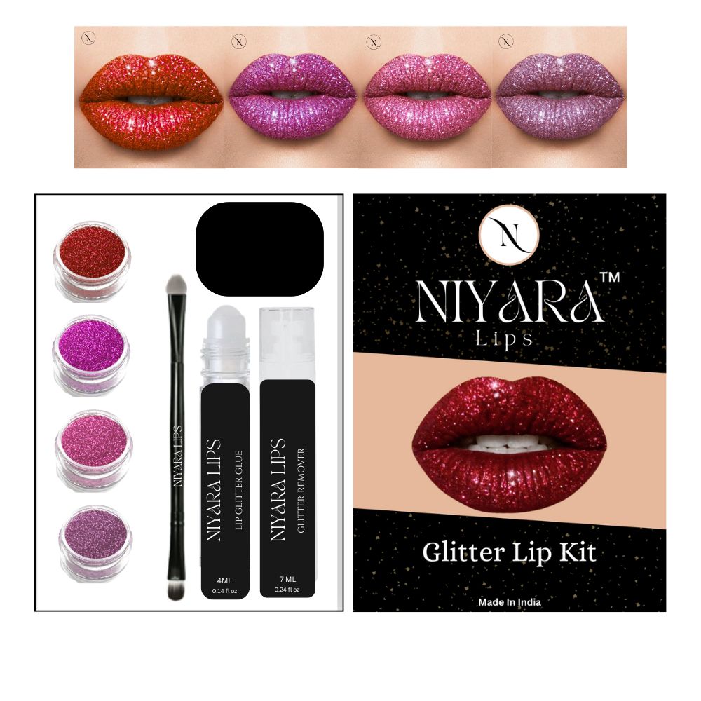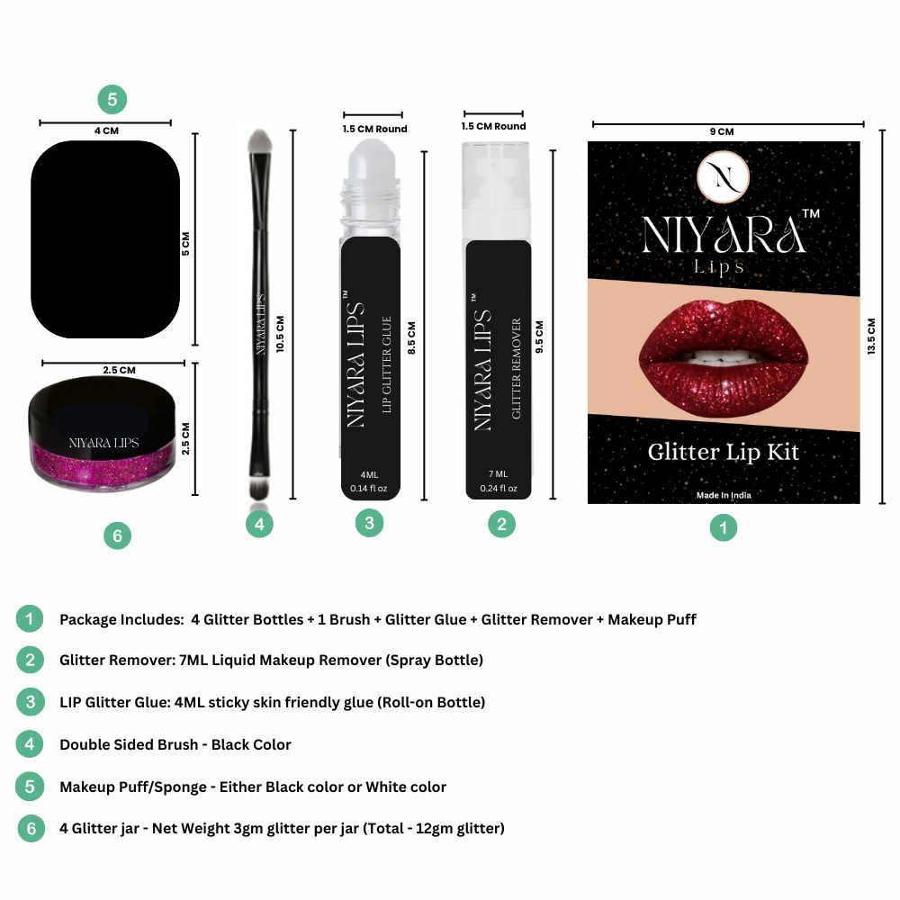 - Complete Glam Set: Dazzle with NiyaraLips Lip Shine Kit— 4x5g Vibrant Glitter Bottles for Bold, Glossy Lips. Includes Cosmetic Adhesive, Makeup Remover, Brush, and Sponge for easy application and flawless removal.